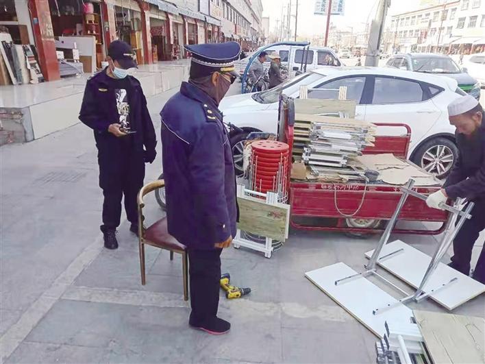 執(zhí)法人員對占道經(jīng)營商戶進(jìn)行勸說。圖由城關(guān)區(qū)城管局提供