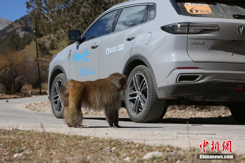 圖為一只藏獼猴近距離接觸2021瀾湄萬(wàn)里行活動(dòng)用車。張希紅 攝