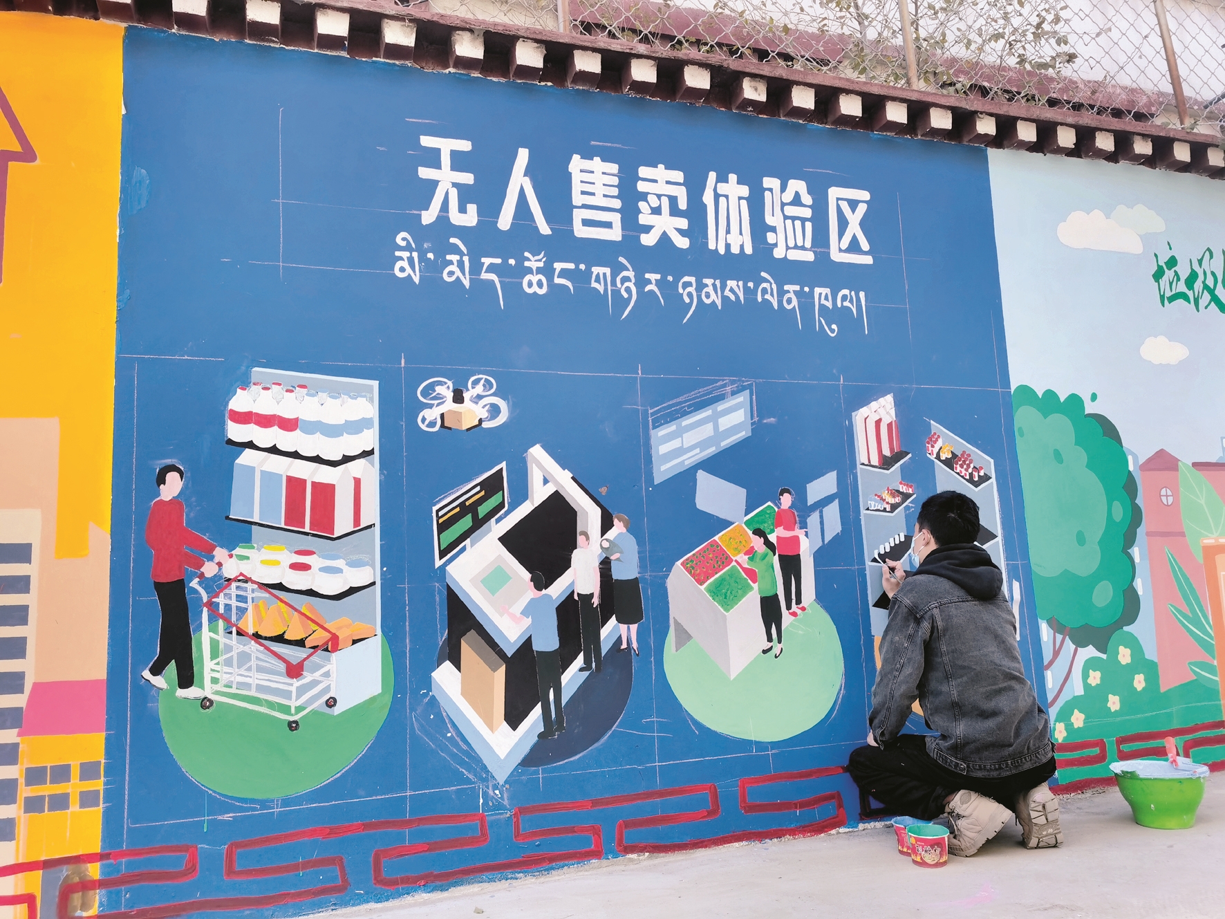 圖為工作人員正在對繞賽社區(qū)哈達巷進行墻繪。拉薩融媒記者 范江英攝