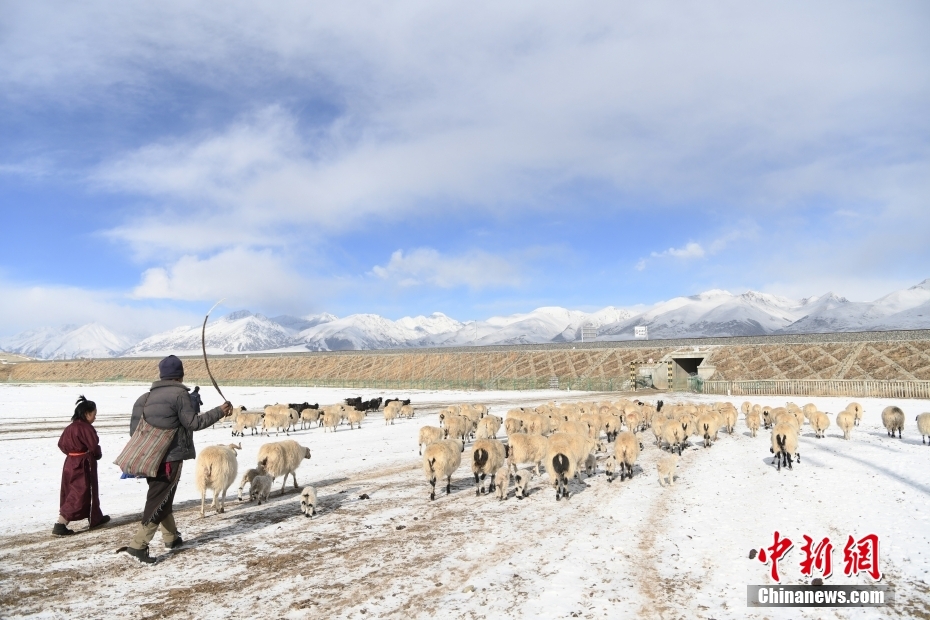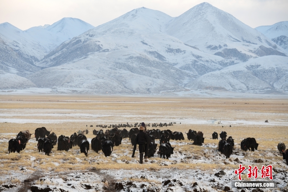 1月27日,當(dāng)雄縣龍仁鄉(xiāng)烏達(dá)村牧民在雪中放牧。當(dāng)雄縣位于西藏自治區(qū)拉薩市北部,距拉薩市區(qū)170公里?!爱?dāng)雄”,藏語(yǔ)意為“天選牧場(chǎng)”,平均海拔約4200米,草場(chǎng)廣闊,土地肥沃。 中新社記者 貢嘎來(lái)松 攝