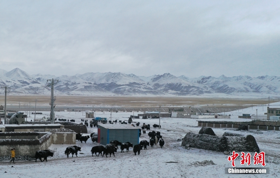 1月27日,當(dāng)雄縣龍仁鄉(xiāng)烏達(dá)村牧民在雪中放牧。當(dāng)雄縣位于西藏自治區(qū)拉薩市北部,距拉薩市區(qū)170公里?!爱?dāng)雄”,藏語(yǔ)意為“天選牧場(chǎng)”,平均海拔約4200米,草場(chǎng)廣闊,土地肥沃。(無(wú)人機(jī)照片) 中新社記者 貢嘎來(lái)松 攝