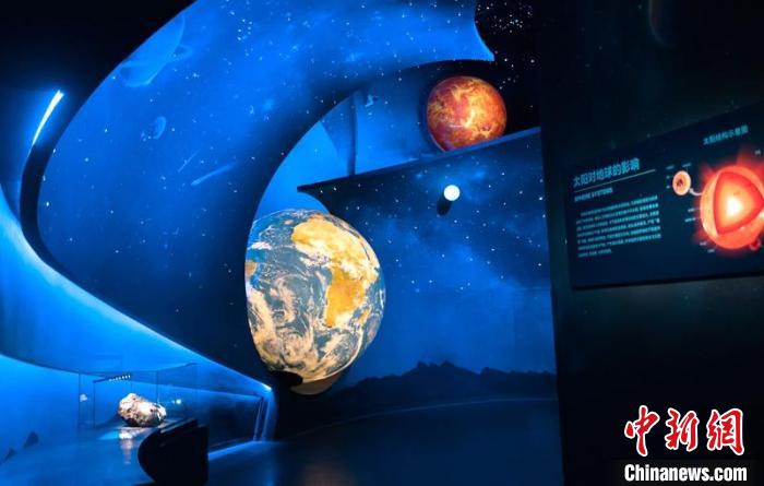 邁步進(jìn)入“地質(zhì)環(huán)境廳”,最最吸睛的,是一個巨大的、緩慢旋轉(zhuǎn)的“地球”,在深藍(lán)色的夜空背景下,地球上的紋理分毫畢現(xiàn)。頂層用微型燈組成的“星空”時不時有流星劃過,照亮了太陽系的其他行星。整個太陽系被高仿真還原,帶光環(huán)的土星、赤紅色的火星、體積最大的木星……