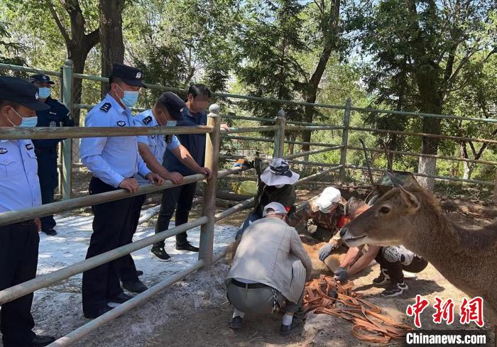 圖為青海省野生動物救助中心工作人員對白唇鹿進(jìn)行檢查?!〖庠h公安局供圖