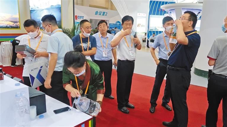 近年來,西藏加快發(fā)展飲用水產(chǎn)業(yè),積極拓展飲用水產(chǎn)品銷售渠道,在區(qū)內(nèi)外各種展覽會、展銷會、博覽會上大力推銷水產(chǎn)品。 圖為2020廈門國際投資貿(mào)易洽談會暨絲路投資大會上,與會者在展示展銷會現(xiàn)場品鑒西藏“地球第三極”產(chǎn)業(yè)發(fā)展有限公司生產(chǎn)的天然飲用水產(chǎn)品。(資料圖片)記者 王超 攝