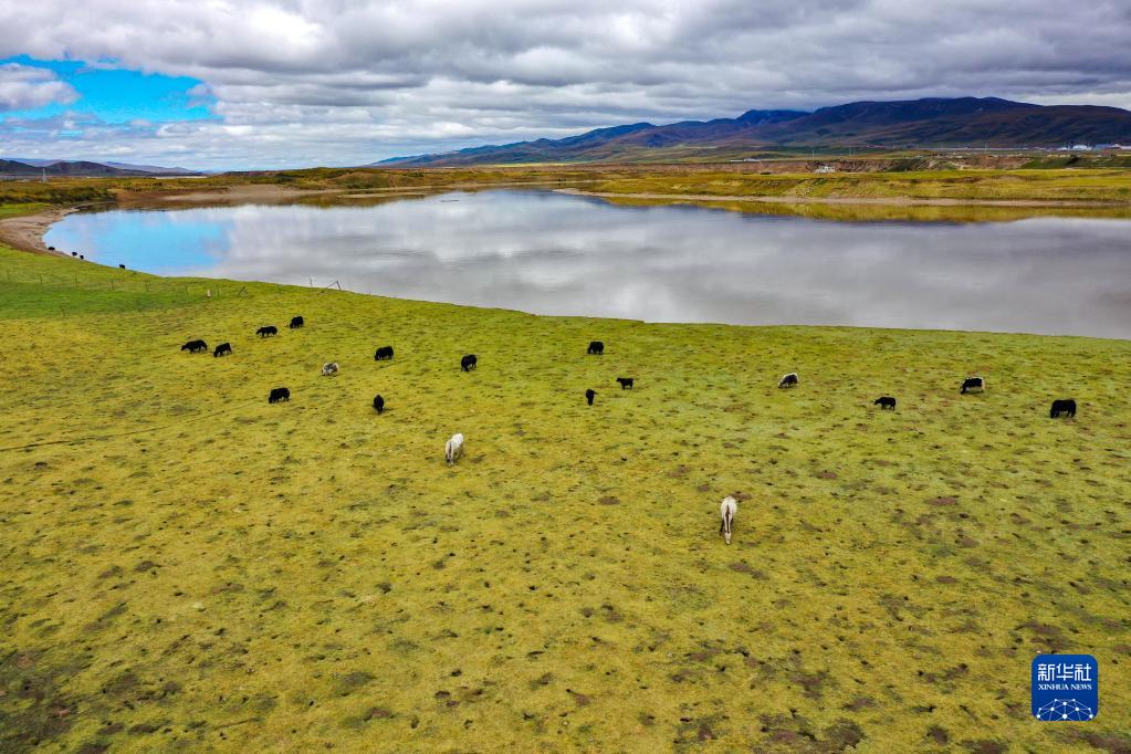 牛群和馬在黃河瑪曲段干流沿岸的一處草地上吃草(9月17日攝,無(wú)人機(jī)照片)?,斍h在2019年就實(shí)現(xiàn)了草畜平衡。新華社記者 郎兵兵 攝