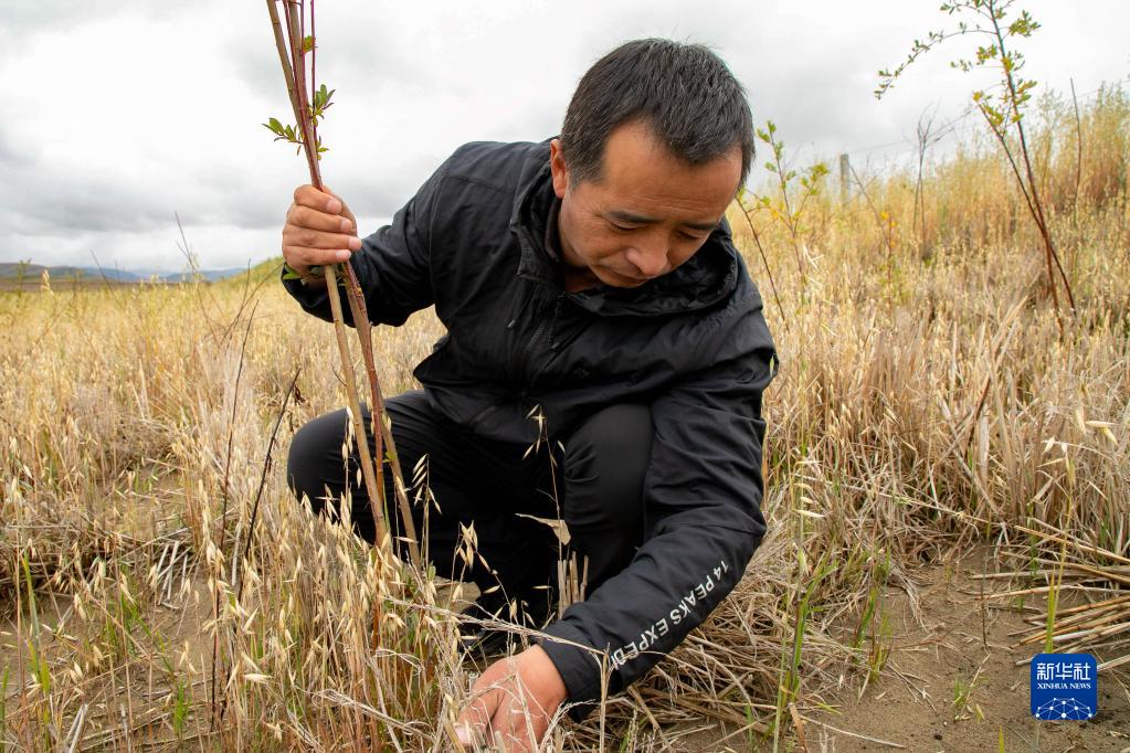 瑪曲縣自然資源局高級(jí)工程師馬建云在黃河瑪曲段干流沿岸一處阻沙林帶建設(shè)區(qū)域觀察植被生長(zhǎng)情況(9月16日攝)。新華社記者 郎兵兵 攝