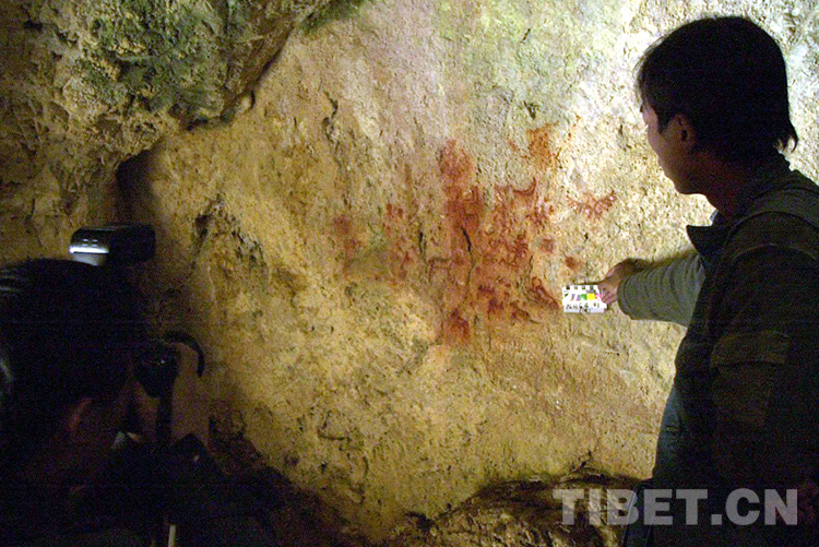 這是科考人員在對一處洞穴巖畫進行考察拍照(唐召明2001年攝)