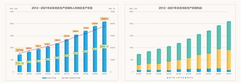 經濟健康快速發(fā)展,地區(qū)生產總值由2012年的710.16億元增長至2021年的2080.17億元。十年來,西藏地區(qū)生產總值增長了152.6%,年均增長9.7%。