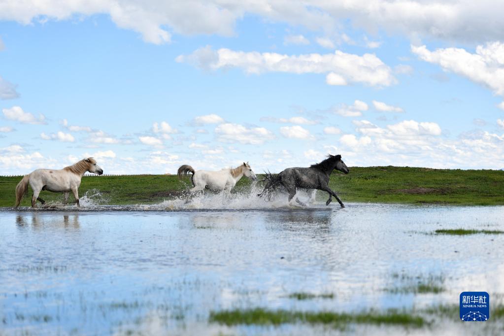 河曲馬在甘肅省甘南藏族自治州瑪曲縣河曲馬場的濕地奔跑(2019年6月22日攝)。新華社記者 陳斌 攝