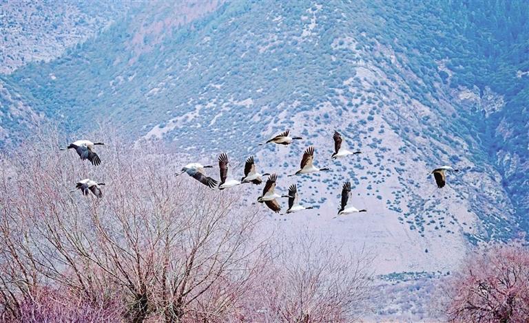 黑頸鶴是世界上唯一生長、繁殖在高原的鶴類,通常活動于海拔3000米以上的開闊農(nóng)田、河谷和濕地,屬國家一級保護動物,林芝是黑頸鶴的重要棲息地之一。據(jù)北京林業(yè)大學郭玉民教授團隊跟蹤監(jiān)測,10月30日以來,今年首批黑頸鶴順利從青海湖附近繁殖地返回林芝越冬地,遷徙直線距離超過1100公里。