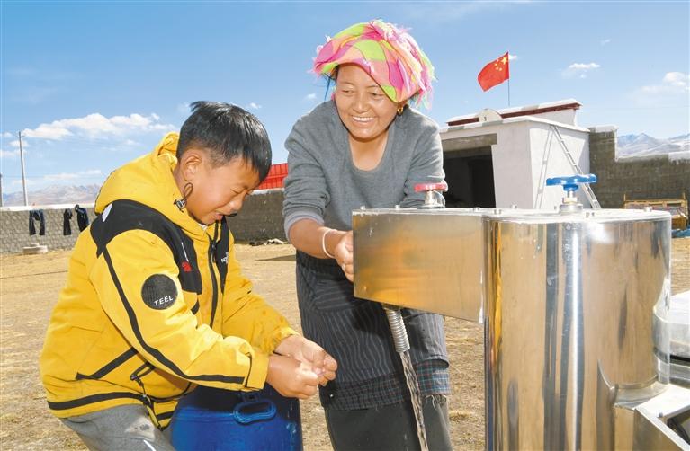 圖為近日,當(dāng)雄縣公塘鄉(xiāng)沖嘎村一組村民拉宗母子在自家院子里用上了干凈、放心的自來(lái)水。記者 洛桑 攝