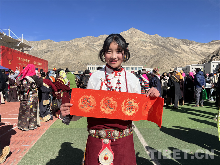“我來自那曲安多縣,在森布日生活已有近一年,這里氣候暖,基礎(chǔ)設(shè)施齊全,真是趕上了好政策”66歲的多布杰說,他還主動拿起書法家現(xiàn)場書寫并贈送給他的吉祥對聯(lián)說:“今天真是很開心,觀看了一場精彩的節(jié)目,還得到了書法家寫的‘扎西德勒’吉祥對聯(lián),這個我要貼在家里的門窗上”。