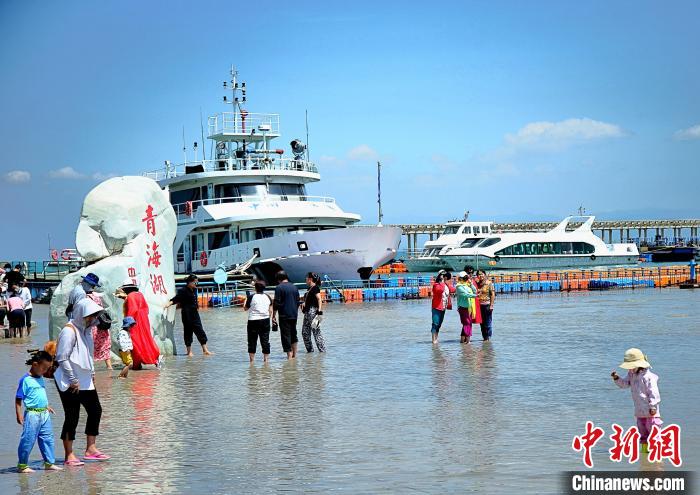 資料圖為游客在青海湖畔水中玩耍。 祁增蓓 攝