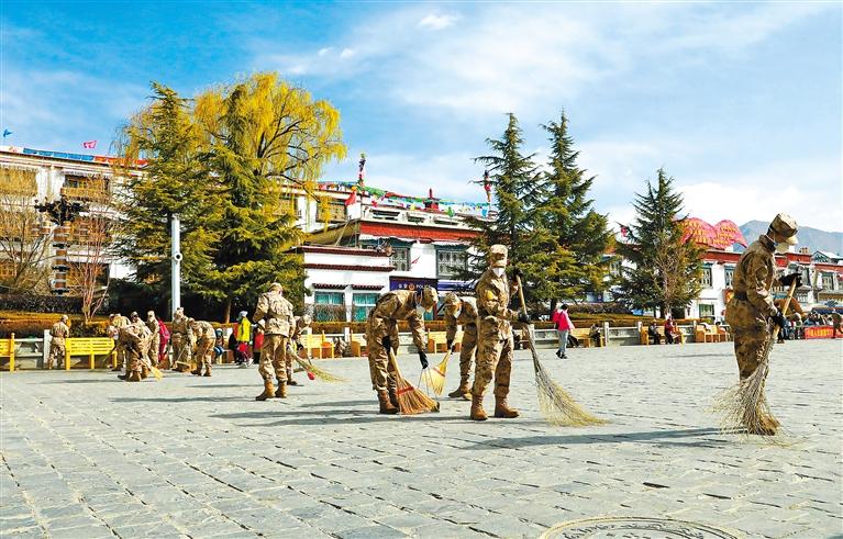 圖為拉薩警備區(qū)某團(tuán)官兵在大昭寺廣場(chǎng)清掃路面。記者 唐斌 通訊員 何琪 攝