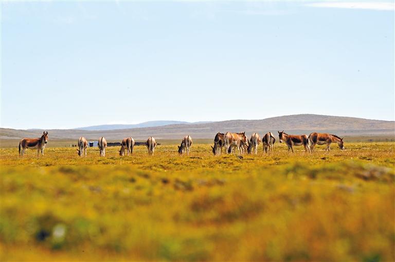 在唐古拉山以北的草原上,成群的藏野驢在覓食。記者 趙書彬 攝