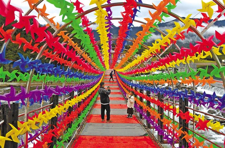 游客在林芝市魯朗鎮(zhèn)扎塘魯錯(cuò)吊橋拍照留念。記者 洛桑 攝