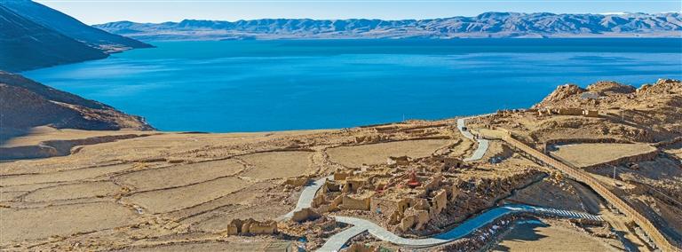 在當(dāng)惹雍錯湖畔,尼瑪縣甲谷鄉(xiāng)吉松村剛剛竣工的棧道和觀景臺(無人機(jī)照片)。新華社記者 格桑朗杰 攝
