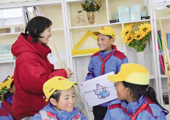 美術(shù)教室布置之初,從一年級(jí)到六年級(jí),二三十名學(xué)生追到新教室,拿著彩筆在墻上畫出一幅幅稚嫩卻充滿童趣的圖畫?!拔蚁氘嬕粋€(gè)城堡,給它圖上美麗的顏色!”“我要把牦牛畫在墻上。”“我要畫個(gè)飛行員”……