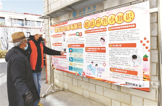 為大學(xué)生志愿者扎西平措在塔瑪小區(qū)內(nèi)的宣傳欄前給路過的居民普及防控知識(shí)。。(本組圖片由拉薩融媒視覺組攝)