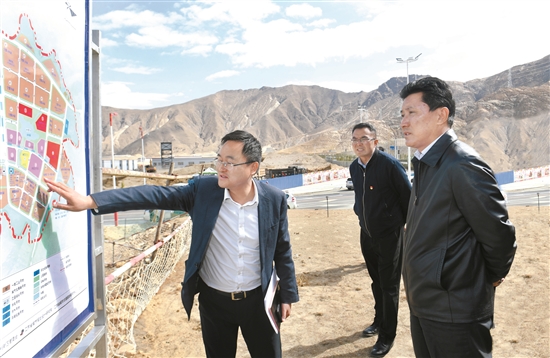 4月16日上午,市委副書(shū)記、市長(zhǎng)、城關(guān)區(qū)委書(shū)記果果調(diào)研拉薩高新區(qū)部分在建項(xiàng)目進(jìn)展情況。圖為果果在施工現(xiàn)場(chǎng)查看工程效果圖、聽(tīng)取拉薩高新區(qū)負(fù)責(zé)人的匯報(bào)。拉薩融媒記者 巴桑次仁攝