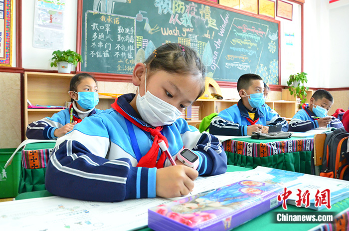 4月15日,玉樹(shù)市第三完全小學(xué)的學(xué)生在課堂上做筆記。中新社記者 魯?shù)り?yáng) 攝