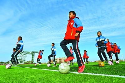 甘肅省民樂生態(tài)工業(yè)園區(qū)學(xué)校足球場(chǎng)上,學(xué)校足球隊(duì)的孩子們進(jìn)行傳球、帶球訓(xùn)練。王將攝/光明圖片