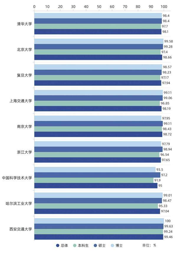 其中,最高的是西安交通大學(xué),畢業(yè)生就業(yè)率達(dá)99.46%;最低的是中國科學(xué)技術(shù)大學(xué),畢業(yè)生就業(yè)率為95%。
