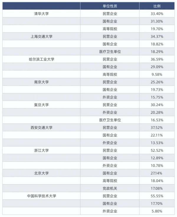 其中,清華大學(xué)的畢業(yè)生更偏向于選擇國有企業(yè),占比31.3%,排名第一;北京大學(xué)則以27.14%的占比排名第三。
