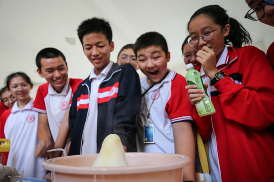 10月26日,北京師范大學(xué)??诟綄賹W(xué)校的學(xué)生參與化學(xué)趣味實(shí)驗(yàn)。當(dāng)日,北京師范大學(xué)??诟綄賹W(xué)校舉行第三屆科技人文節(jié)活動(dòng),在校內(nèi)營造愛科學(xué)、學(xué)科學(xué)的良好氛圍。[詳細(xì)] -