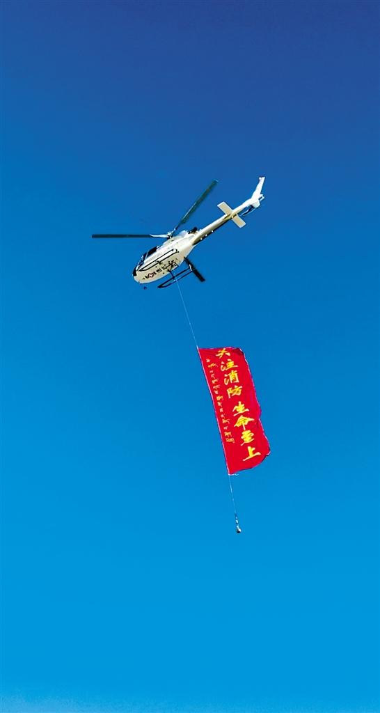 直升機(jī)攜帶”關(guān)注消防 生命至上“的標(biāo)語(yǔ)開展空中宣傳。