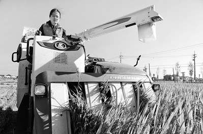 江蘇省太倉市璜涇鎮(zhèn)雅豐農(nóng)場,農(nóng)業(yè)委培大學(xué)生范盈丹駕駛收割機在稻田間收割水稻。計海新攝/光明圖片