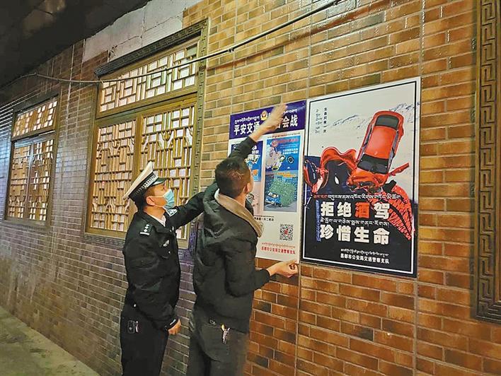 圖為林芝市公安交警支隊(duì)民警在張貼宣傳資料。記者 張黎黎 攝