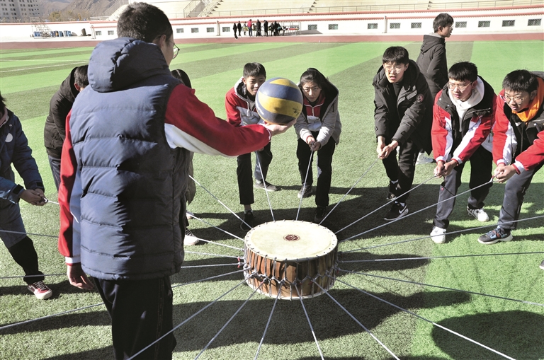 上午10時,課間操時間,拉薩北京中學全體學生集中在學校操場,在西藏塔嘎布體育發(fā)展公司教練的帶領下,該校兩個班級50多名學生興高采烈地參與到拓展運動中,一起進行“花開花落”“擊鼓顛球”“動力繩”等7個項目的拓展運動訓練。同學們通過共同合作完成指定運動,在歡笑聲中一起進行趣味運動。拉薩北京中學相關負責人表示,此次趣味體育拓展活動不僅有利于促進學生的心理素質(zhì),還能增強學生之間的團隊意識,希望同學們積極參與、發(fā)揚體育精神。