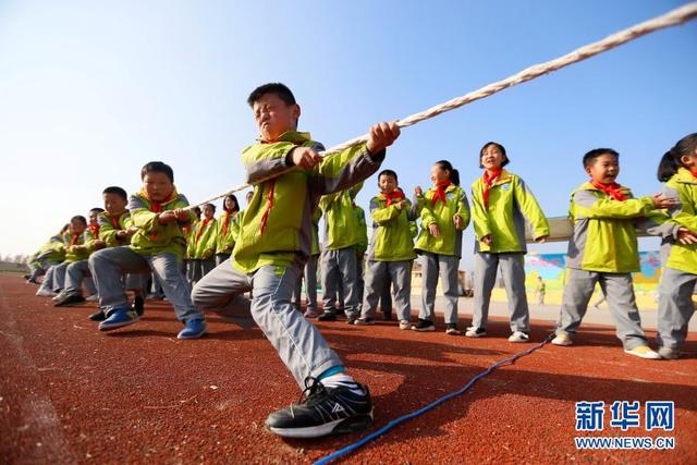 11月12日,學(xué)生在大課間參加拔河比賽。 位于山東省青島市即墨區(qū)的青島藍(lán)谷高新區(qū)東皋埠小學(xué)是一所鄉(xiāng)村學(xué)校,近年來,學(xué)校開展以乒乓球、籃球、跳繩等運(yùn)動為主的大課間活動,讓孩子們在享受運(yùn)動的同時(shí)愉悅身心,增強(qiáng)體質(zhì)。 新華社發(fā)(梁孝鵬攝)