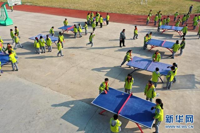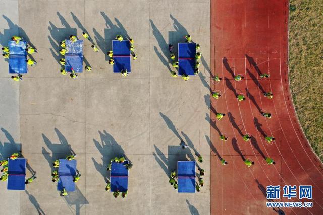 11月12日,學(xué)生在大課間打乒乓球(無人機(jī)照片)。 位于山東省青島市即墨區(qū)的青島藍(lán)谷高新區(qū)東皋埠小學(xué)是一所鄉(xiāng)村學(xué)校,近年來,學(xué)校開展以乒乓球、籃球、跳繩等運(yùn)動為主的大課間活動,讓孩子們在享受運(yùn)動的同時(shí)愉悅身心,增強(qiáng)體質(zhì)。 新華社發(fā)(梁孝鵬攝)