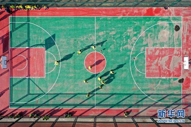 11月12日,學(xué)生在大課間打籃球(無人機(jī)照片)。 位于山東省青島市即墨區(qū)的青島藍(lán)谷高新區(qū)東皋埠小學(xué)是一所鄉(xiāng)村學(xué)校,近年來,學(xué)校開展以乒乓球、籃球、跳繩等運(yùn)動為主的大課間活動,讓孩子們在享受運(yùn)動的同時(shí)愉悅身心,增強(qiáng)體質(zhì)。 新華社發(fā)(梁孝鵬攝)