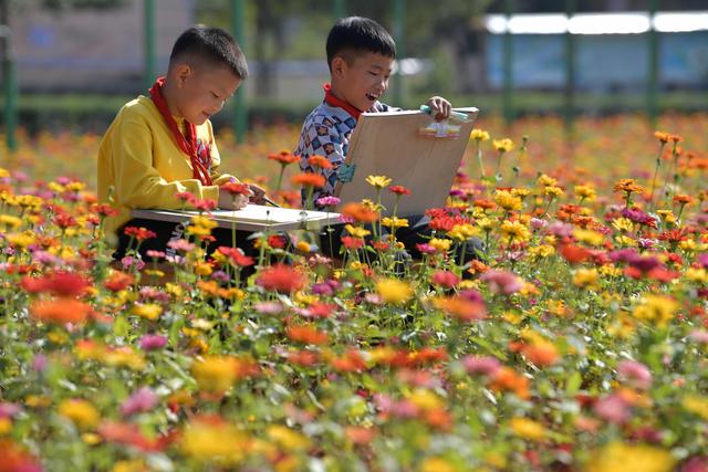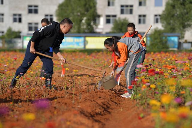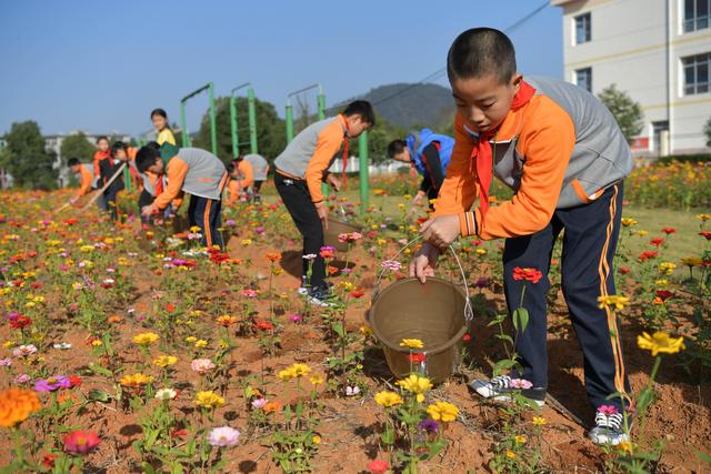 今年暑假剛剛到任江西省宜春市袁州區(qū)寨下鎮(zhèn)中心小學(xué)的殷大福校長看著教學(xué)樓前一大片長滿雜草的荒地,希望能在上面做點文章,讓孩子們課后有個休閑活動的好去處。于是,他和老師們一起平整荒地,種下百日草的種子,開辟出花田和草坪。如今,昔日的荒地上已綻放出一片絢爛的花海,學(xué)生們的學(xué)習(xí)生活因此更加豐富多彩。美術(shù)課、十字繡興趣小組的同學(xué)紛紛到花田邊寫生、采風(fēng),孩子們在綠地里玩耍訓(xùn)練。每周,殷大福校長還會組織不同班級的學(xué)生下田勞動,為鮮花松土、施肥、澆水,讓他們親身體驗守護(hù)生活中美好的滋味。呵護(hù)、陪伴、欣賞……一顆顆真善美的種子在學(xué)生們的心底悄然種下。