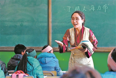 因?yàn)闊釔郏詫W?。青海省玉樹藏族自治州囊謙縣東壩鄉(xiāng)寄宿學(xué)校教師桑丁卓瑪,精心準(zhǔn)備每一堂課,認(rèn)真上好每一堂課,受到學(xué)生的喜愛。這是她在為五年級(jí)學(xué)生上漢語(yǔ)文課。