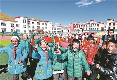 和學(xué)生們?cè)谝黄?,是桑丁卓瑪最開心的時(shí)刻。她專門給學(xué)生帶來國(guó)旗、國(guó)旗貼,為他們講述國(guó)旗下民族團(tuán)結(jié)好故事。