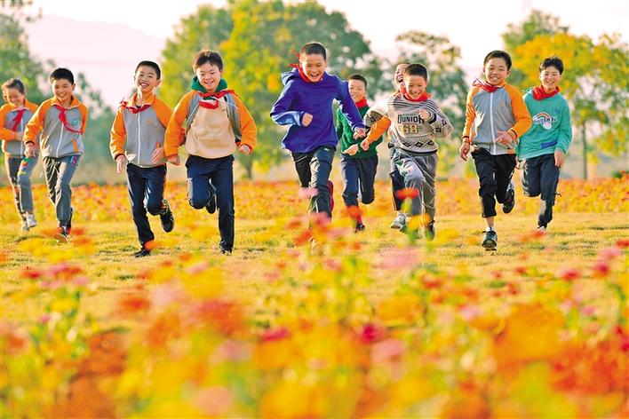 在江西省宜春市袁州區(qū)寨下中心小學,學生們在花田邊玩耍(11月9日攝)。新華社記者 彭昭之 攝