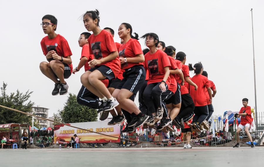 11月26日, 廣西大學(xué)附屬中學(xué)初中年級(jí)學(xué)生在集體跳繩比賽中。新華社記者張愛林?jǐn)z