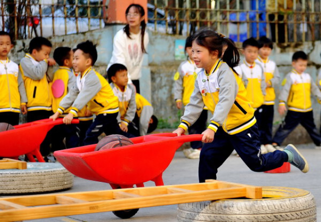 圖為幼兒園的小朋友正在進(jìn)行小推車運(yùn)球比賽。卓忠偉 徐穎 攝