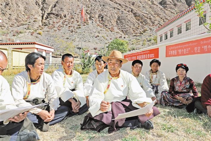 圖為昌都市芒康縣如美鎮(zhèn)竹卡村村“兩委”班子成員和駐村工作隊(duì)向村民宣講黨的十九屆五中全會(huì)精神。洛桑 唐斌 攝