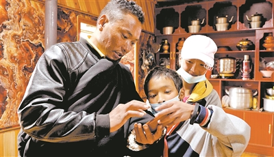 四川省甘孜藏族自治州道孚縣八美鎮(zhèn)九年一貫制學(xué)校藏族學(xué)生益洛在家做爸爸的漢語(yǔ)小翻譯。任赫 攝