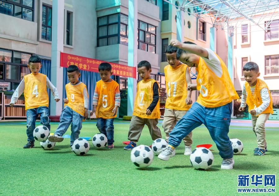 西藏自治區(qū)實驗幼兒園大班的孩子在進行足球訓練(2019年8月22日攝)。新華社記者孫非 攝