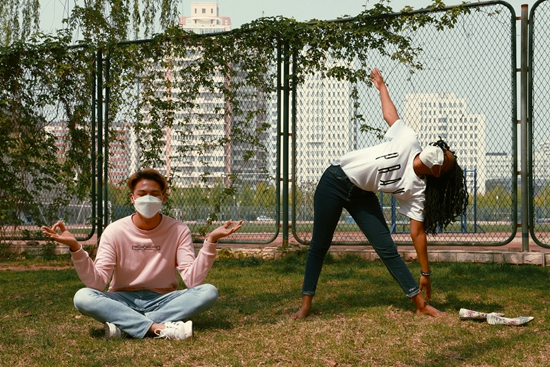 2020年4月14日,北京,對(duì)外經(jīng)濟(jì)貿(mào)易大學(xué)的來華留學(xué)生在戶外鍛煉。李享/攝