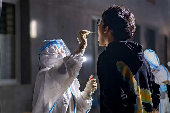 2020年10月14日,山東省青島市,中國(guó)石油大學(xué)(華東),醫(yī)護(hù)人員對(duì)學(xué)生進(jìn)行核酸檢測(cè)。當(dāng)日,青島新增一例新冠肺炎本地確診病例。田瑜亮/攝