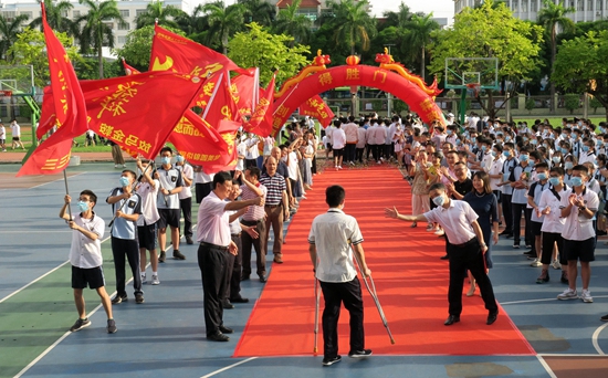 2020年7月6日,廣西南寧市第三十三中學(xué),一名拄著拐杖的高考生在老師同學(xué)的鼓勵(lì)下走向“得勝門”。當(dāng)日,該校舉辦高考“出征”儀式,祝福學(xué)生高考取得勝利。區(qū)明慶/攝