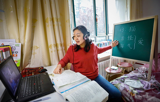 2020年3月25日,江蘇省連云港市,一名小學(xué)語文教師在家中給學(xué)生線上授課。受疫情影響,學(xué)校提倡 “停課不停學(xué)”,號(hào)召學(xué)生在家上課。張曉青/攝