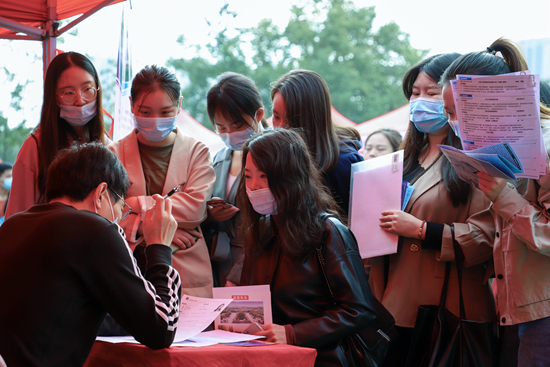 2020年10月24日,湖北省武漢市,華中師范大學(xué)武漢部屬高校聯(lián)合招聘會(huì)上,畢業(yè)生與用人單位交流。唐麗香/攝